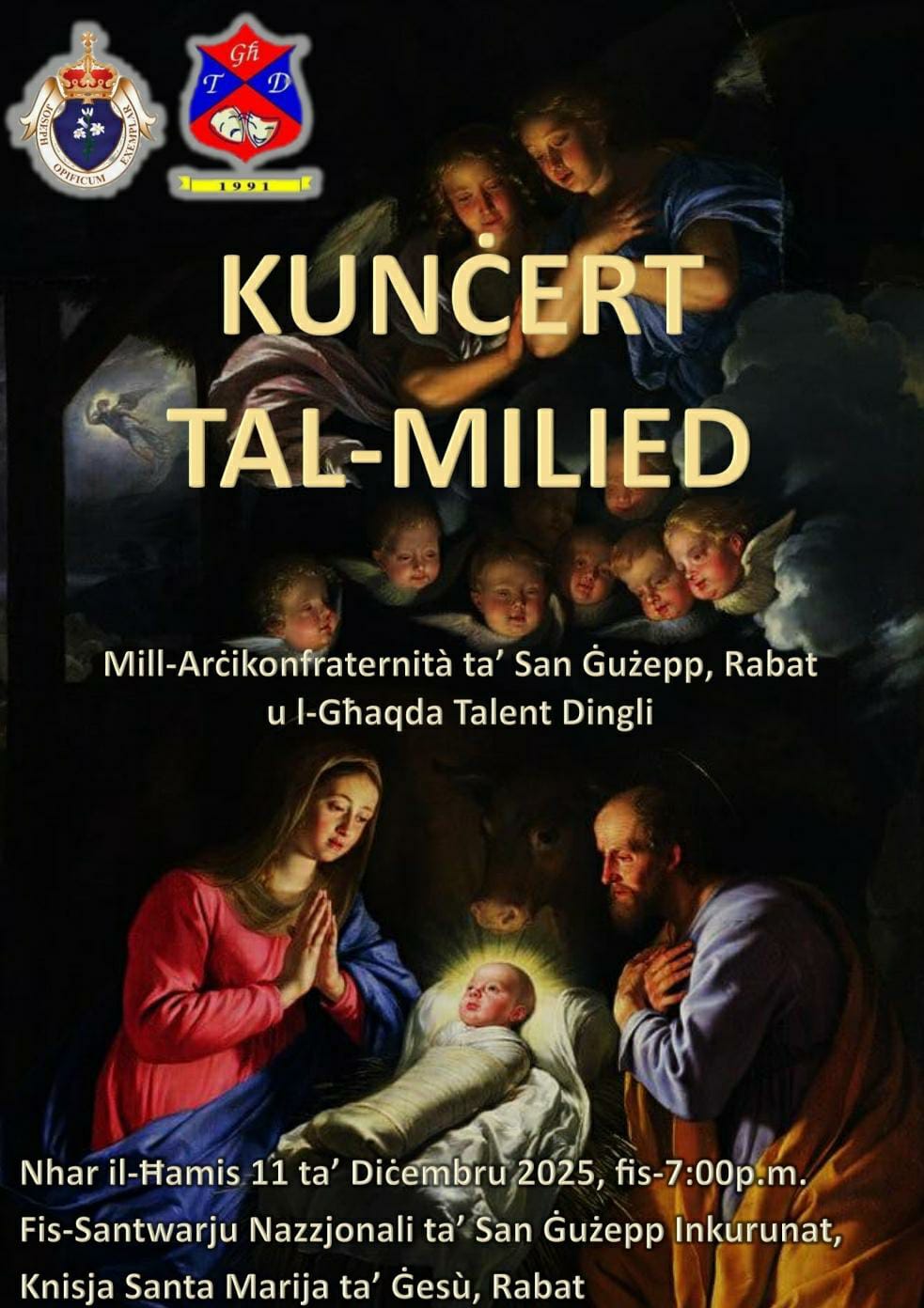 L- Arċikonfraternita’ ta’ San Ġużepp Rabat flimkien mal-Grupp Kitarri tal-Għaqda Talent Dingli se jorganizzaw kunċert mużikali tal-Milied nhar il-Ħamis 11 ta’ Diċembru 2025, fis-Santwarju Nazzjonali ta’ San Ġużepp Inkurunat, ir-Rabat, fis-7pm.