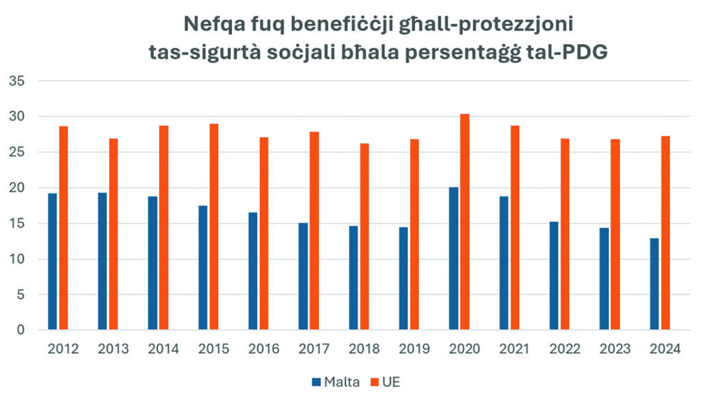 Mhux dejjem kien hekk! Kif jidher anki fit-tabella li qed nuru ma’ din il-kitba fl-2013, in-nefqa f’benefiċċji għall-protezzjoni tas-sigurtà soċjali kienet 19.2 fil-mija tal-Prodott Domestiku Gross (PDG) — fl-istess waqt li dik tal-Unjoni Ewropea kienet ta’ 26.9 fil-mija. Statistika li tfisser li d-differenza kienet ta’ 7.7 fil-mija.