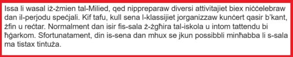 “Issa li wasal iż-żmien tal-Milied, qed nippreparaw diversi attivitajiet biex niċċelebraw dan il-perjodu speċjali. Kif tafu, kull sena l-klassijiet jorganizzaw kunċert qasir b’kant, żfin u reċtar. Normalment dan isir fis-sala ż-żgħira tal-iskola u intom tattendu bi ħġarkom. Sfortunatament, din is-sena dan mhux se jkun possibbli minħabba li s-sala ma tistax tintuża.”