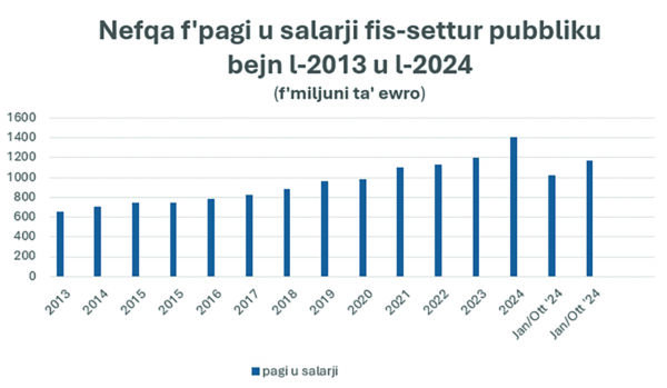 Ħela kbira ta’ flus hemm fil-mijiet ta’ impjiegi ta’ fiduċja li qed jingħataw, li qed ikabbru n-nefqa tal-Gvern f’pagi u salarji bil-miljuni (ara tabella). Ħaddiema li kieku jinstabilhom xogħol mas-settur privat il-Gvern ikun qed inaqqsu mill-ħaddiema li jitqabdu minn barra pajjiżna u jnaqqsu n-nefqa tal-Gvern.