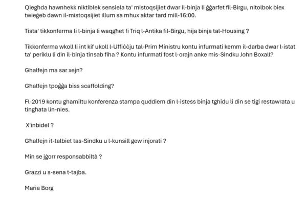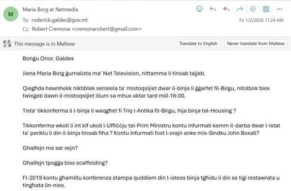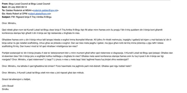 Mhux hekk biss, il-Ministru Galdes b’mod inkreddibli qal li issa qed tiġi indirizzatta b’mod konkret, dan meta ilbieraħ il-Ġimgħa Net News esklussivament ippublika sensiela ta’ emails li s-Sindku John Boxall kien bagħat lill-Ministru Roderick Galdes fl-2023, fl-2024, u fl-2025. Dawn l-emails kienu mibgħuta wkoll lill-Uffiċċju tal-Prim Ministru.