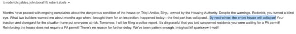 Madanakollu bosta residenti li tkellmu magħna saħqu li l-apramorta ma waqgħetx bil-maltemp, iżda sforz il-ħsara li kellha, bil-Ministru kien ilu snin jaf bis-sitwazzjoni.