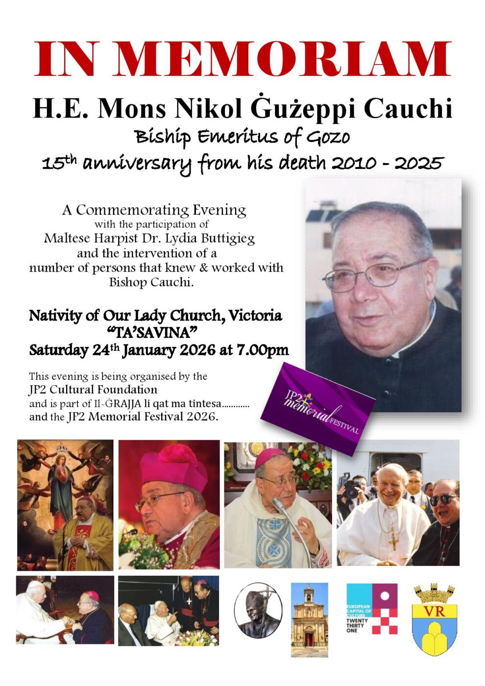 Fil-15 ta’ Novembru 2025, Għawdex ikkommemora l-15-il anniversarju mill-mewt tal-Eċċellenza Tiegħu Mons Nikol Ġużeppi Cauchi, Isqof Emeritu tad-Djoċesi ta’ Għawdex. Il-Fondazzjoni Kulturali JP2 se tonorah b’lejla ta’ tifkira, “IN MEMORIAM”.