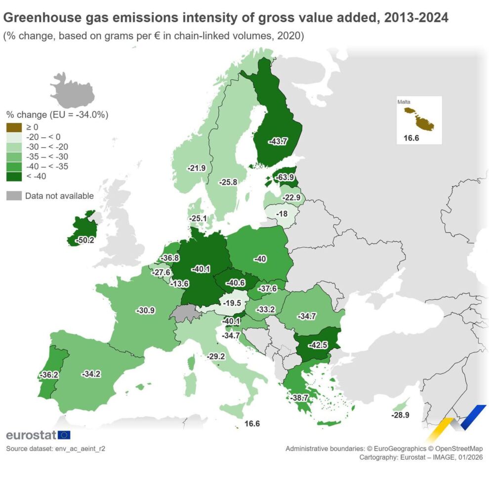 Iċ-ċifri tal-Eurostat – l-aġenzija tal-Unjoni Ewropea li tiġbor u tippubblika statistika uffiċjali dwar il-pajjiżi Ewropej – li ġew ippubblikati fl-aħħar jiem, juru li filwaqt li Malta hi l-uniku pajjiż li flok naqqset, żiedet l-intensità tal-emissjonijiet, pajjiżi oħra qed jiksbu suċċessi impressjonanti fil-ġlieda kontra t-tniġġis tal-arja, fosthom l-Estonja li naqqset l-emissjonijiet b’64%, l-Irlanda b’50% u l-Finlandja b’44%.
