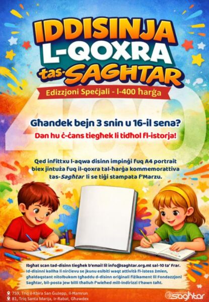 Fondazzjoni Sagħtar qed tistieden lill-istudenti kollha ta’ bejn it-3 snin u s16-il sena biex jieħdu sehem f’kompetizzjoni speċjali u storika f’għeluq l400 ħarġa tar-rivista Sagħtar. L-istudenti se jingħataw l-opportunità unika biex jiddisinjaw huma stess il-qoxra (il-cover) tal-400 ħarġa tar-rivista Sagħtar, li se tiġi stampata f’Marzu li ġej.