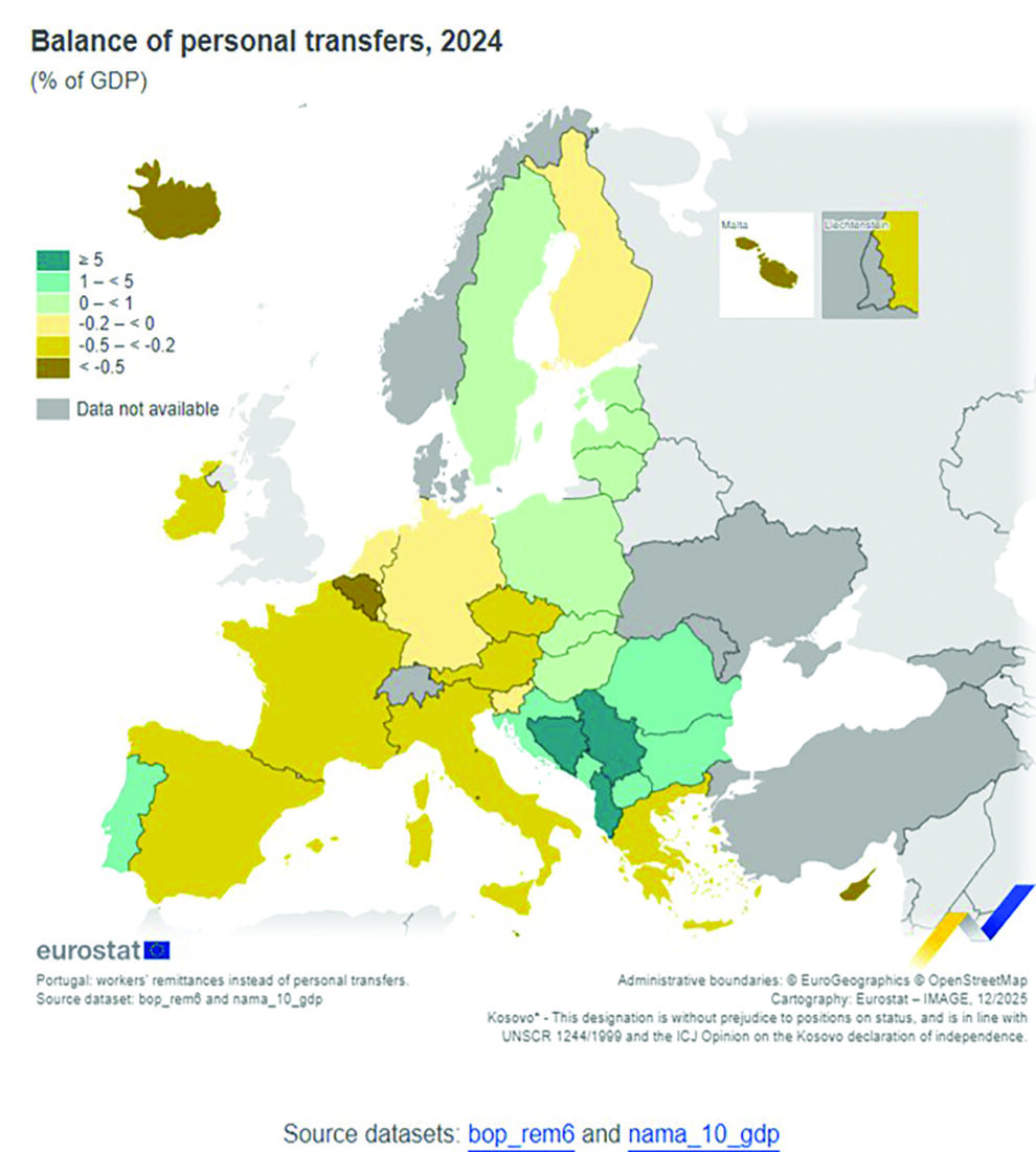 Fl-2024 dawn l-immigranti fil-pajjiżi tal-Unjoni Ewropea ttrasferixxew għal pajjiżi barra l-UE €52,100 miljun. Irċivew lura €14,800 miljun. Li għalhekk ħalla lill-Unjoni Ewropea bi żbilanċ ta’ €37,300 miljun. Li jekk neħduha mil-lat pożittiv tfisser għajnuna diretta lill-familji u lill-pajjiż minfejn ikunu ġew.