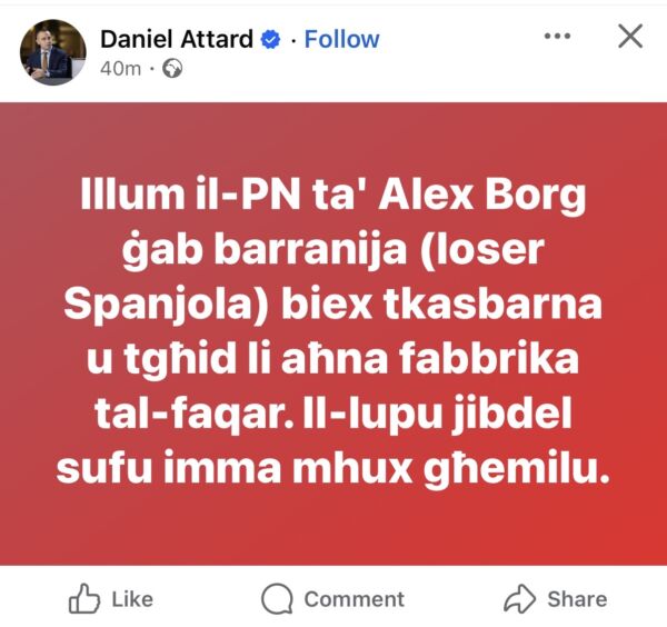 L-MEP Laburista Daniel Attard, li huwa membru tas-soċjalisti Ewropej fetaħ l-attakk tiegħu fuq s-Segretarju Ġenerali tal-akbar partit fil-Parlament Ewropew, l-EPP ‘loser’.