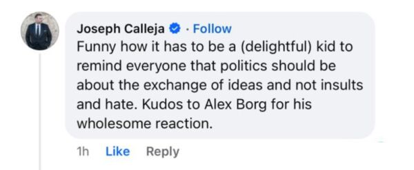 “Nirrispettak, imma jien mal-Labour”, qal it-tifel b’mod mill-aktar ġenwin. B’Alex Borg iwieġeb bit-tbissima solita tiegħu u jgħidlu “ma jimpurtax, nieħu gost li tkellimna ftit”.