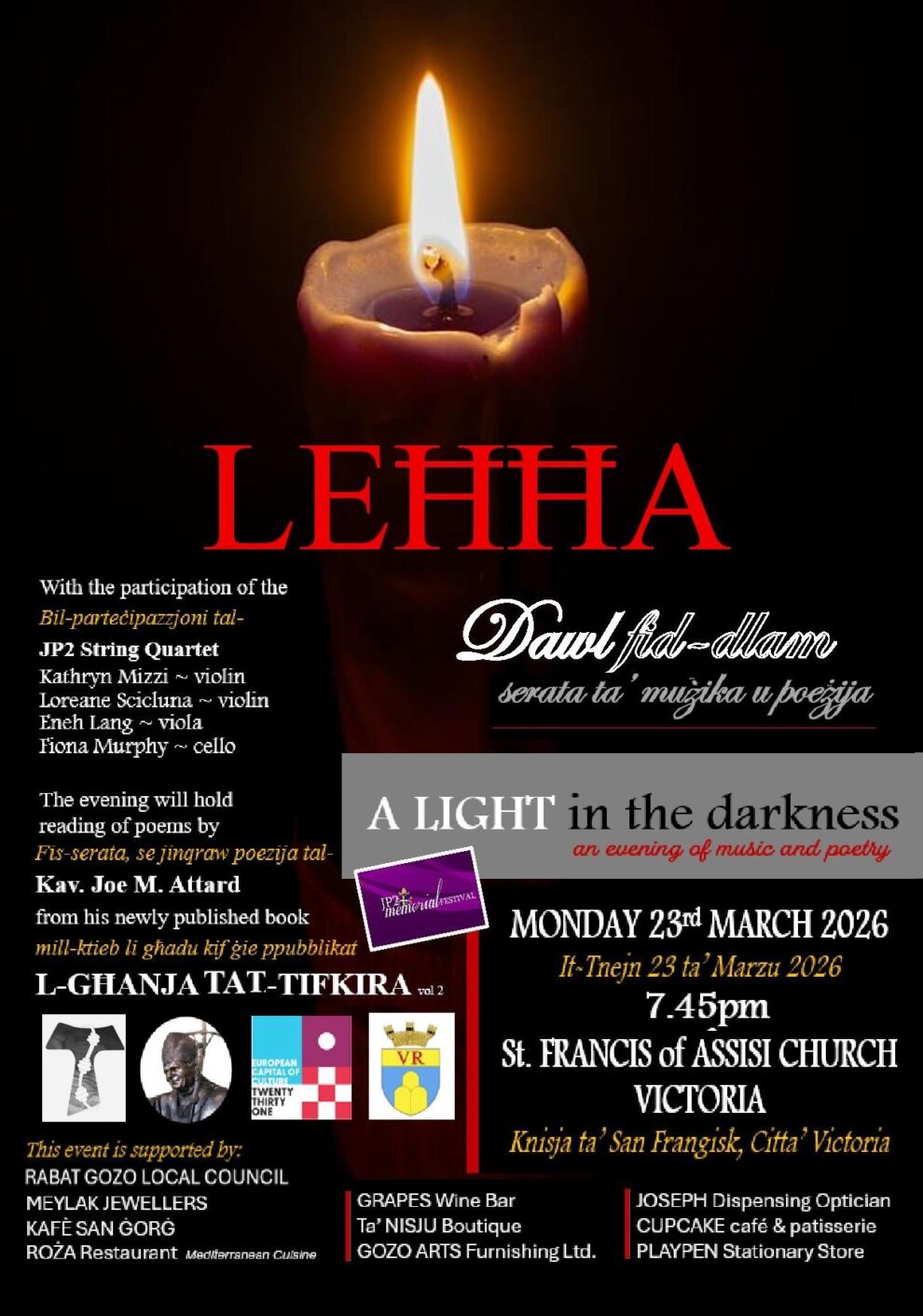 Il-Fondazzjoni Kulturali Papa San Ġwanni Pawlu II (JP2 Cultureal Foundation) ser torganizza serata ta’ mużika u poeżija “LEĦĦA Dawl fid-Dlam” matul dan iż-żmien ta’ tħejjija għall-Ġimgħa Mqaddsa.