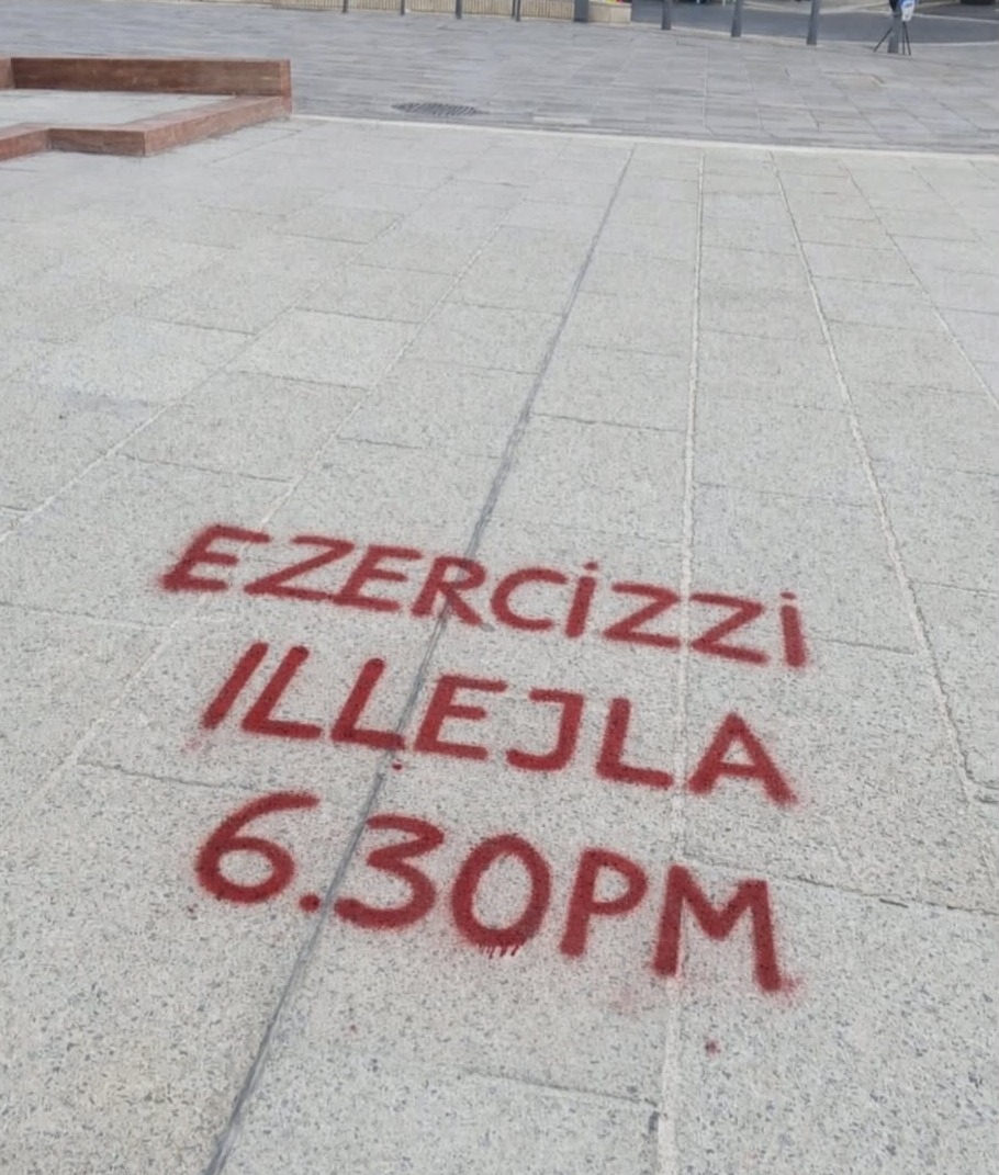 Fil-Birgu, l-eżerċizzi tal-koppji bdew din il-ġimgħa. U xi ħadd ġietu l-idea li bħala pubbliċità, jiktbu biż-żebgħa fil-paviment tal-Pjazza tal-Birgu … “EŻERĊIZZI LLEJLA 6:30PM”.