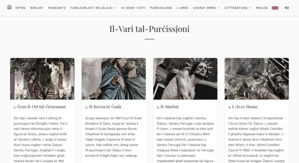 Permezz ta’ dan il-portal, wieħed jista’ jsib informazzjoni dwar wirjiet, pageants, ir-rotta tal-purċissjoni tal-Ġimgħa l-Kbira, l-istorja tal-vari, kif ukoll sezzjonijiet dedikati għal-letteratura u dettalji dwar l-użanzi u t-tradizzjonijiet marbuta ma’ dawn il-jiem. Is-sit jinkludi wkoll kalendarju ta’ attivitajiet u tagħrif dwar funzjonijiet uniċi bħall-Erbgħa tat-Tniebri u l-użu taċ-ċuqlajta tradizzjonali ‘Idionia’, kif ukoll informazzjoni dwar l-Irxoxt u San Girgor.