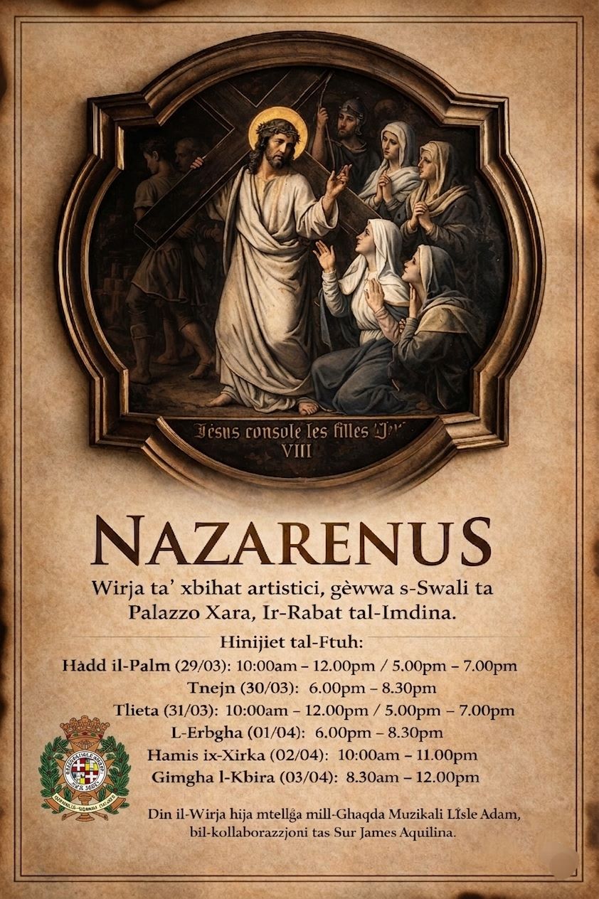 Il-wirja għandha t-tema ta’ Nazarenus u se tkun miftuħa sal Jum il-Ġimgħa l-Kbira f’nofsinhar. Illum bejn is-6.pm u t-8.30pm; għada festa pubblika bejn l-10 u 12pm u l-5pm u s-7pm; nhar l-Erbgħa bejn is-6pm u t-8pm; Ħamis ix-Xirka bejn l-10 am u l-11pm u f’jum il-Ġimgħa l-Kbir bejn it-8.30am sa 12pm,