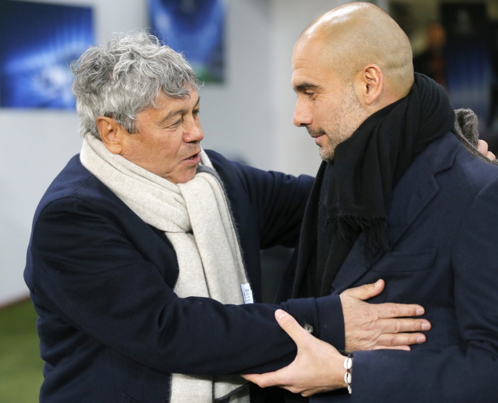epa04624749 Shakhtar head coach Mircea Lucescu (L) and Bayern Munich head coach Josep Guardiola (R) before the UEFA Champions League Round of 16, first leg soccer match between Shakhtar Donetsk and Bayern Munich at the Arena in Lviv, Ukraine, 17 February 2015. The match ended 0-0. EPA/SERGEY DOLZHENKO