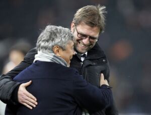 epa03582662 Mircea Lucescu (L), the head coach of Shakhtar and Jurgen Klopp, the head coach of Dortmund reacts during their UEFA Champions League, Round of 16, first leg soccer match of Ukrainian Shakhtar Donetsk vs Borussia Dortmund of Germany on the Donbass Arena stadium in Donetsk, Ukraine, 13 February 2013. EPA/SERGEY DOLZHENKO