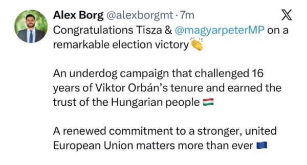 F’post fuq il-pjattaforma ‘X’ il-Kap tal-Partit Nazzjonalista Alex Borg awgura lill-Partit Tisza għar-rebħa elettorali li kiseb fl-Ungerija.