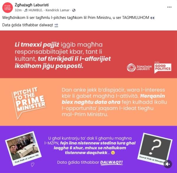 Iżda, permezz ta’ post fuq facebook, matul il-jum tal-ġimgħa kkonfermaw li l-Prim Ministru li tant jgħid li ż-żgħażagħ huma fiċ-ċentru tal-politika tiegħu – ikkanċella attività taż-żgħażagħ. Filwaqt li ma tawx data għal meta se tkun qed issir din l-attività.