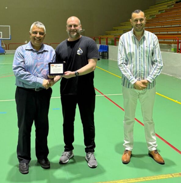 Dr Kenneth Vella, President ta’ Paola Volleyball Club jagħti tifkira lil Michael Magro, coach tal-istess team Pawlist.