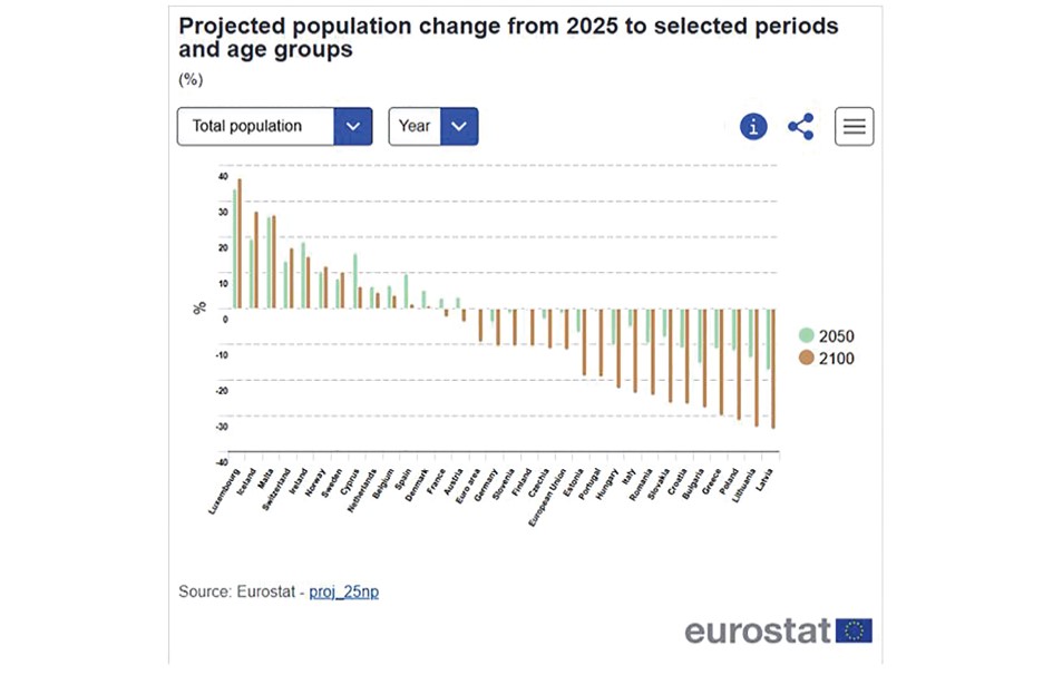 Is-sehem ta’ dawk ta’ iktar minn 65 sena fl-Unjoni Ewropea hu proġettat li jikber iżjed mid-doppju sas-sena 2100. Fl-istess waqt li n-numru tal-anzjani ser jiżdied, dak taż-żgħażagħ ta’ bejn 0-19 hu proġettat li jonqos f’termini assoluti minn sehem ta’ 23.3% (99.4 miljun) tal-popolazzjoni tal-UE għal 16.7% (66.6 miljun) fl-2100. Dawk ta’ etajiet bejn l-20 u l-64 sena, snin li l-bniedem jaħdem, huma proġettati li jonqsu minn 61% (262 miljun) fil-bidu tal-2025 għal 49.7% (198.4 miljun) fl-2100 – jew 63.6 miljun inqas. Is-sehem tal-anzjani ta’ 65 u iktar hu proġettat li jiżdied minn 12.4% (67.9 miljun) fil-bidu tal-2025 għal 33.6% (133.8 miljun) fl-2100. Dawn iċ-ċifri kollha juru stampa skoraġġanti għall-Ewropa. It-tnaqqis fil-popolazzjoni tal-kontinent tagħna ilu ġej. It-twissijiet ilhom hemm. Papa Franġisku kien xeba’ jitkellem dwar xitwa demografia fl-Ewropa. Hemm pajjiżi li ħadu miżuri biex jekk tal-inqas ma jitfgħux lura din it-tendenza, iwasslu għal stabbilità.