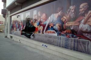 Reklam kontroversjali li feġġ ħdejn l-università ta’ Malta li jirreklama l-ikel permezz ta’ pittura li turi t-twaqqif tal-Ewkaristija, spiċċa fil...