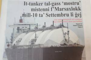 Storja fuq il-faċċata tal-gazzetta Il-Mument tiżvela kif it-tanker tal-gass ‘mostru’ bl-isem Armada LNG Mediterrana mistenni jidħol f’nofs il...