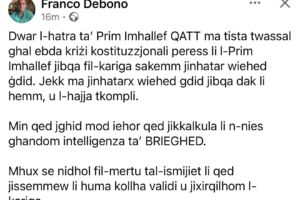 Fi kliem l-avukat Franco Debono, il-kwistjoni marbuta mal-ħatra ta’ Prim Imħallef “ma tista’ twassal għall-ebda kriżi Kostituzzjonali”...