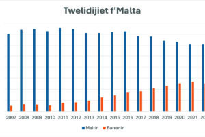 Ħarsa lejn il-grafika tindika kemm qed jonqsu t-twelidijiet tal-Maltin u kemm qed jiżdiedu dawk tal-barranin. Fl-2007 nisa Maltin u Għawdxin welldu 3,519-il...