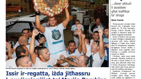 In-Nazzjon fl-ewwel paġna tippubblika r-ritratt tar-rebħ tax-shield tar-regatta tradizzjonali ta’ Jum il-Vitorja li ntrebħet minn Bormla. Ir-regatta saret minkejja...