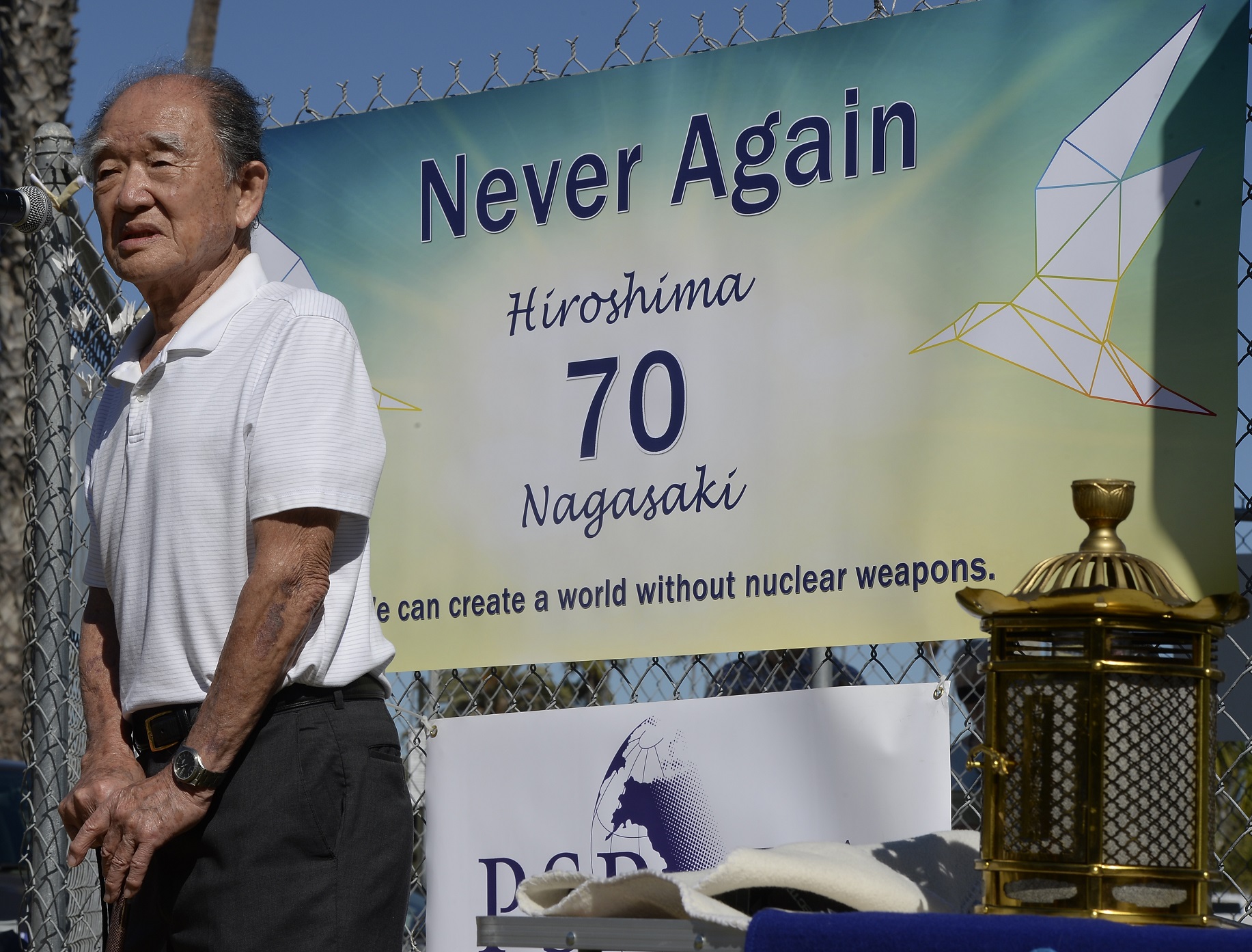 epa04873709 86-year old Hiroshima survivor, Juni Sarashina recounts his experiences during the Hiroshima atomic bombing at the 'Never Again - Hiroshima and Nagasaki 70th Anniversary Commemoration' vigil and moment of silence at the Chain Reaction Peace Sculpture in Santa Monica, California, USA, 05 August 2015. The 06 August and 09 August 1945 atomic bombings of the two Japanese cities resulted in the immediate deaths of at least 129,000 people. EPA/MIKE NELSON