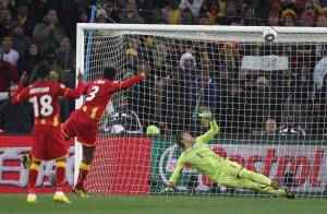 epa02234337 Ghana's Asamoah Gyan (C) hits the crossbar on his penalty shot above Uruguay goalkeeper Fernando Muslera (R) during the FIFA World Cup 2010 quarter final match between Uruguay and Ghana at the Soccer City stadium outside Johannesburg, South Africa, 02 July 2010. EPA/SRDJAN SUKI Please refer to www.epa.eu/downloads/FIFA-WorldCup2010-Terms-and-Conditions.pdf